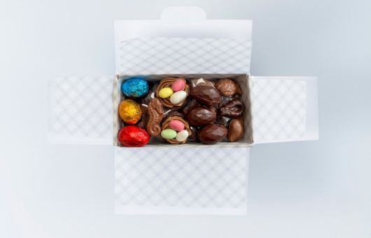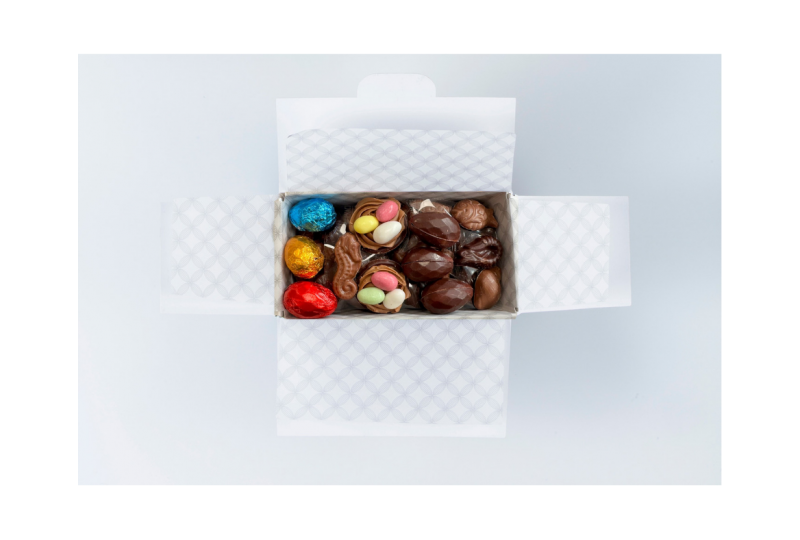 Selection of moldings filled with praline, fried food and assorted eggs. Mix of dark and milk chocolates.