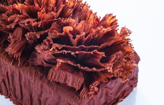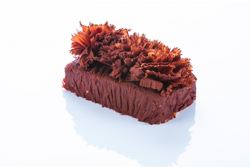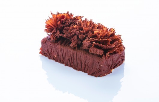Praline ganache decor and chocolate shavings.