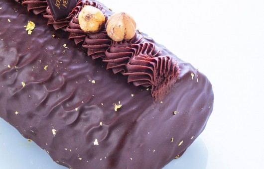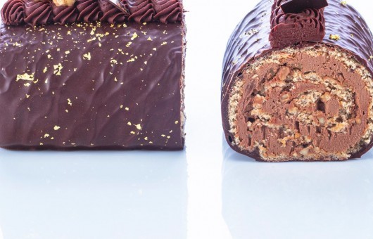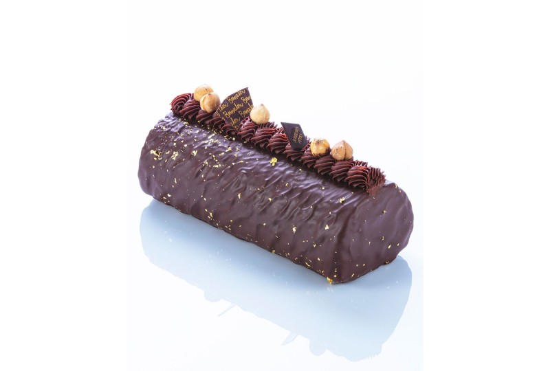 Un délicieux biscuit noisettes et amandes, ganache pralinée aux noisettes, éclats de noisettes, enrobage chocolat noir